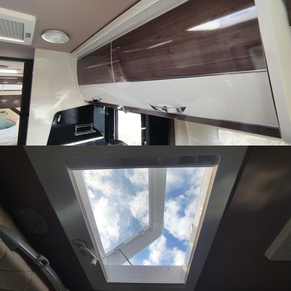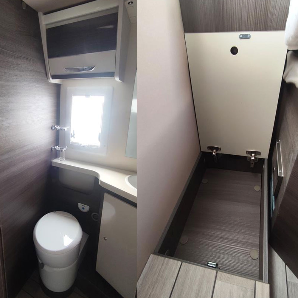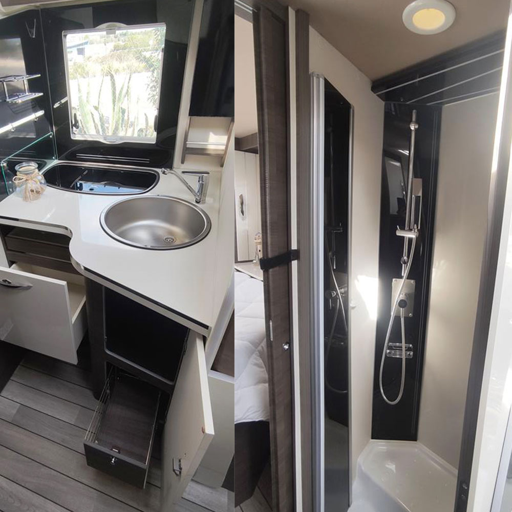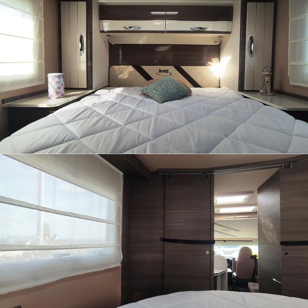 Distribución: Cama trasera en isla (salida por ambos lados), Cama doble suspendida sobre cabina. Baño independiente de la ducha. Cinco plazas para viajar y cuatro para dormir (5ª plaza para dormir opcional).